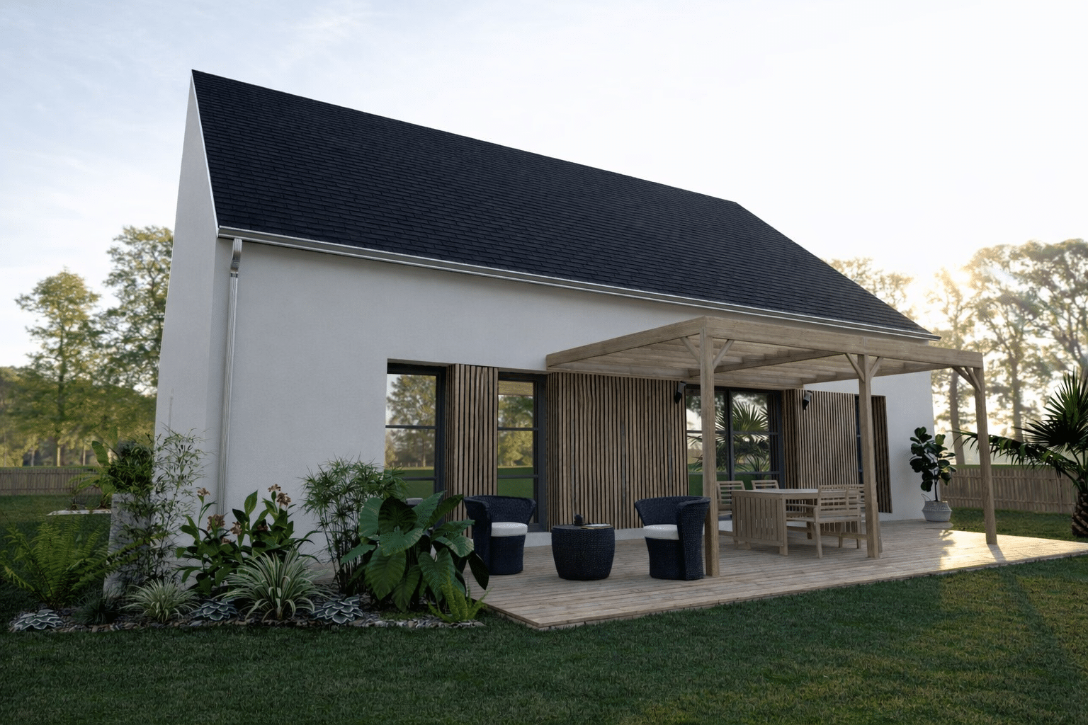 Le projet propose une maison contemporaine d’environ 90 m² habitables, conçue pour offrir confort et fonctionnalité :