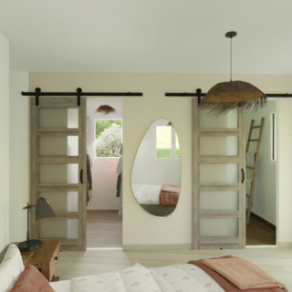 Exemple de maison possible sur ce terrain en illustration : plain pied avec 1 suite parentale avec dressing et salle d’eau, une deuxième chambre, une deuxième salle d’eau, un bureau, une buanderie, une pièce de vie d’environ 43 m².